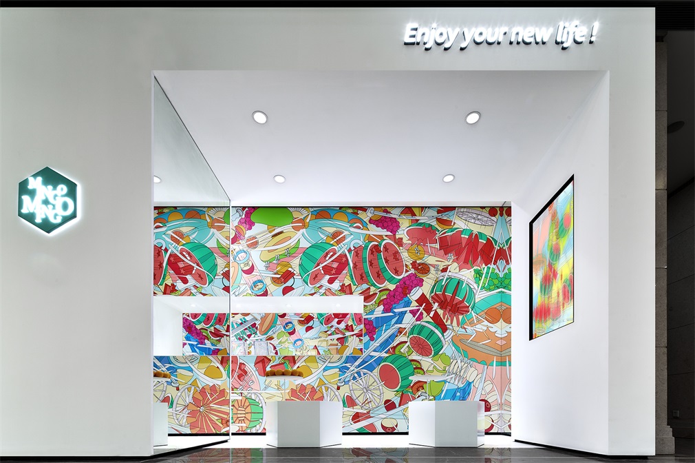 The roughly 12-meters-long and 4-meters-high façade is filled with a huge mural called Cutting Fruits. The thickened doorframe becomes the frame of the mural. The 5-meter-deep shallow and long space is divided in two. The front area is used for sale and the back for production. Three big windows are created out of the mural to connect the two areas. The images cut out by the windows are moved to the walls of the production area in the back so the mural looks complete from the façade of the shop. The staff and customers walk through different layers of the mural. All the other elements, pillars, walls, and furniture, are all kept simple with white painted or mirror surface, which is to bring out the giant “billboard” Cutting Fruits. Billboard architecture is internalized as billboard interior.